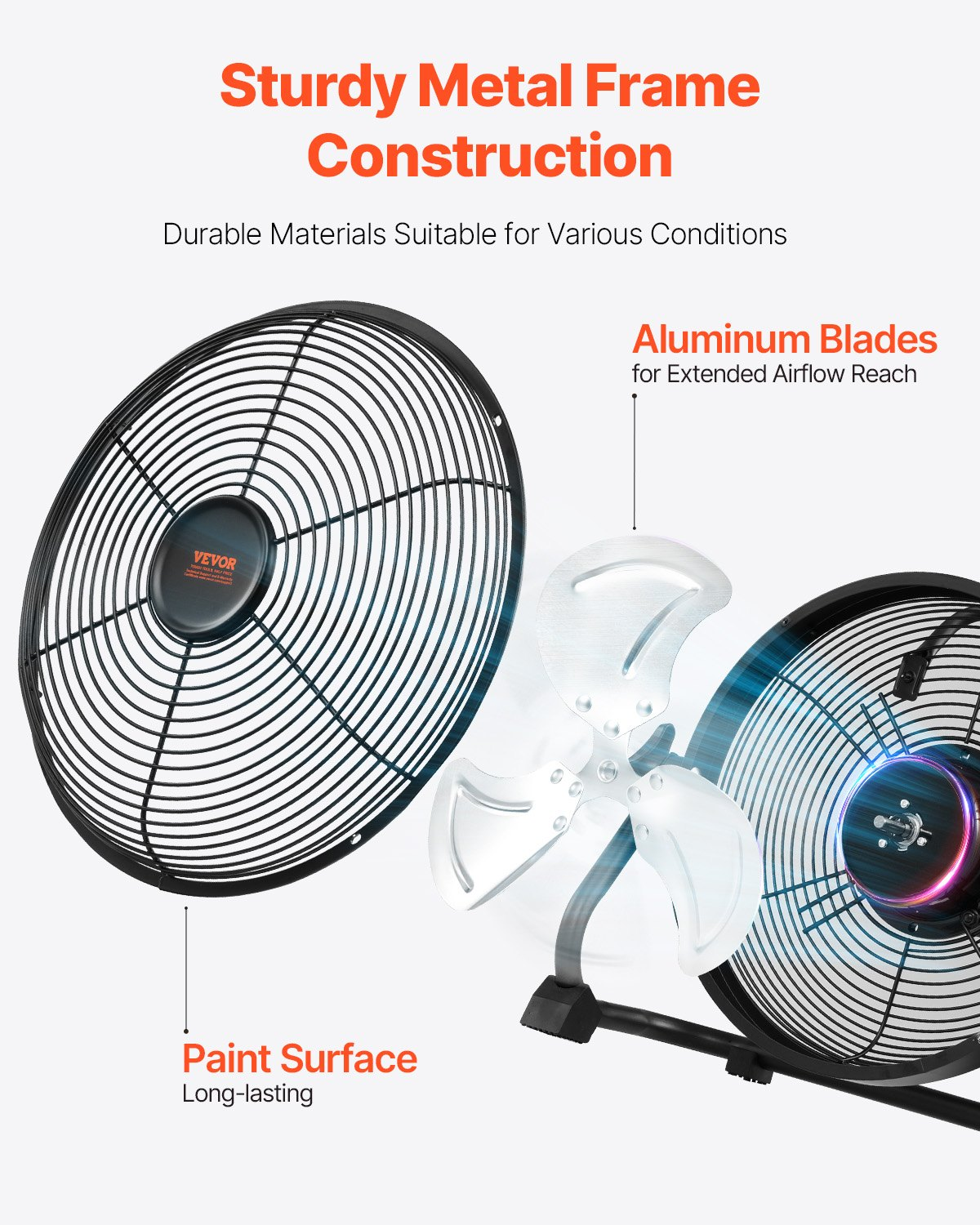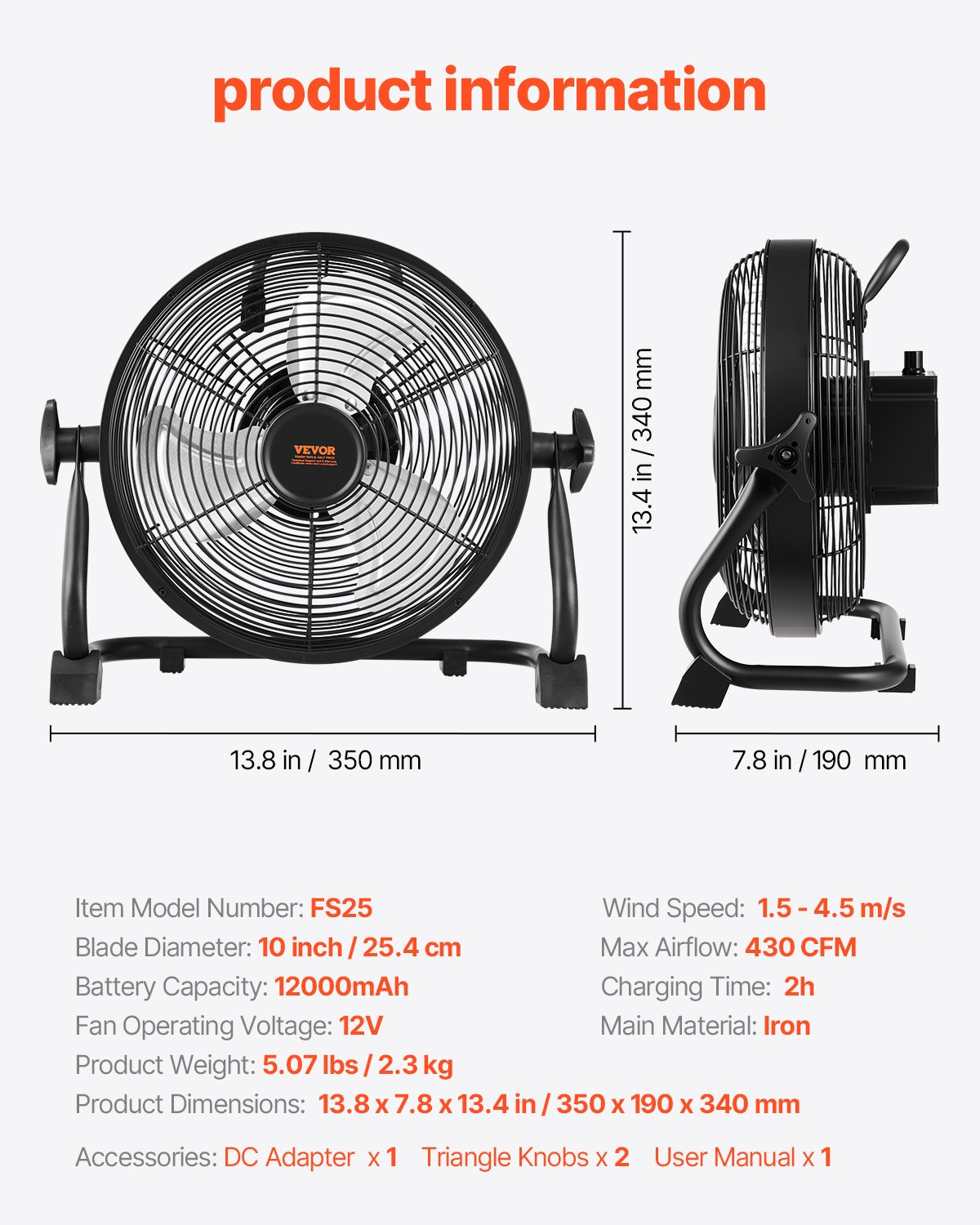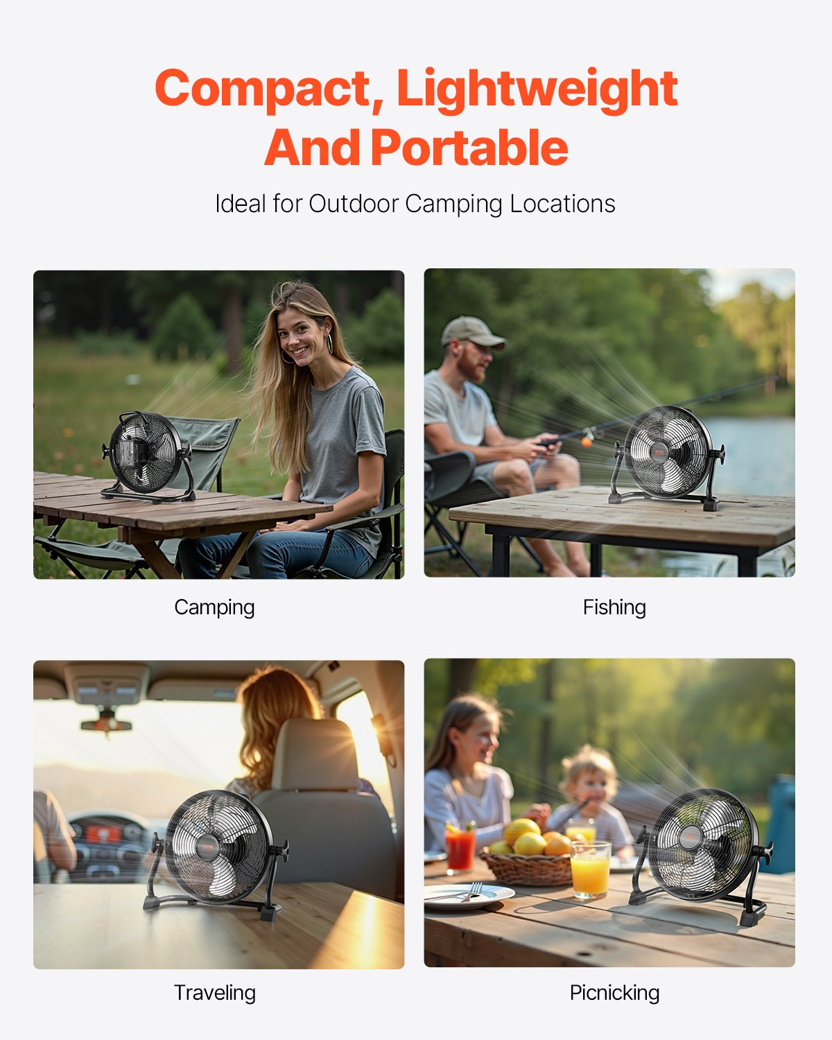 VEVOR 10 inch Rechargeable Battery Operated Camping Floor, High Velocity Portable Outdoor Fan with Metal Frame, Copper Brushless Motor, 360-degree Manual Rotation,for Fishing,Traveling, Picnicking