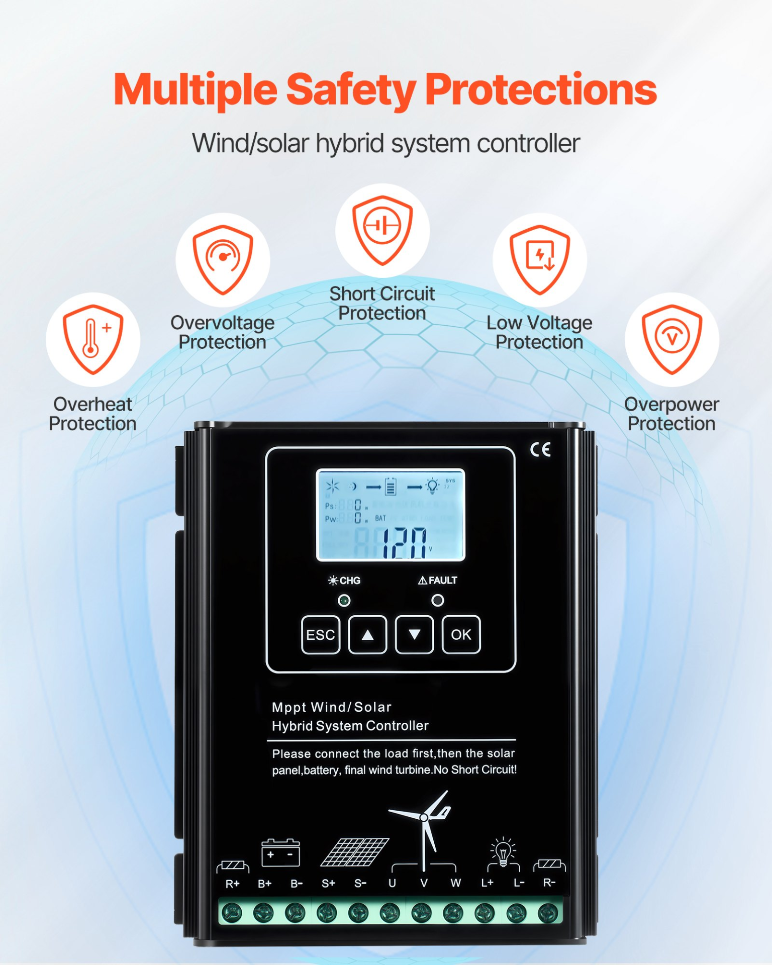 VEVOR 12V 600W Solar Wind Power Kit, 2PCS 100W Solar Panel + 400W Wind Turbine + 12.8V 100Ah LiFePO4 Battery + 1000W Power Inverter + MPPT Hybrid Controller for Home RV Boat Off-Grid Applications