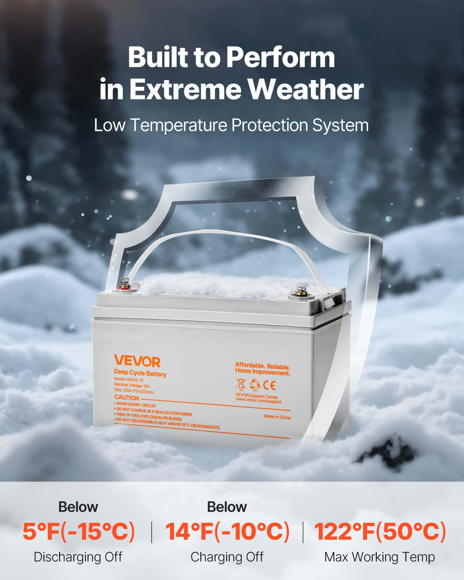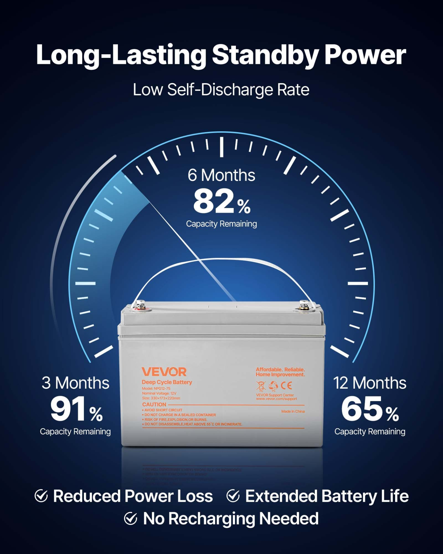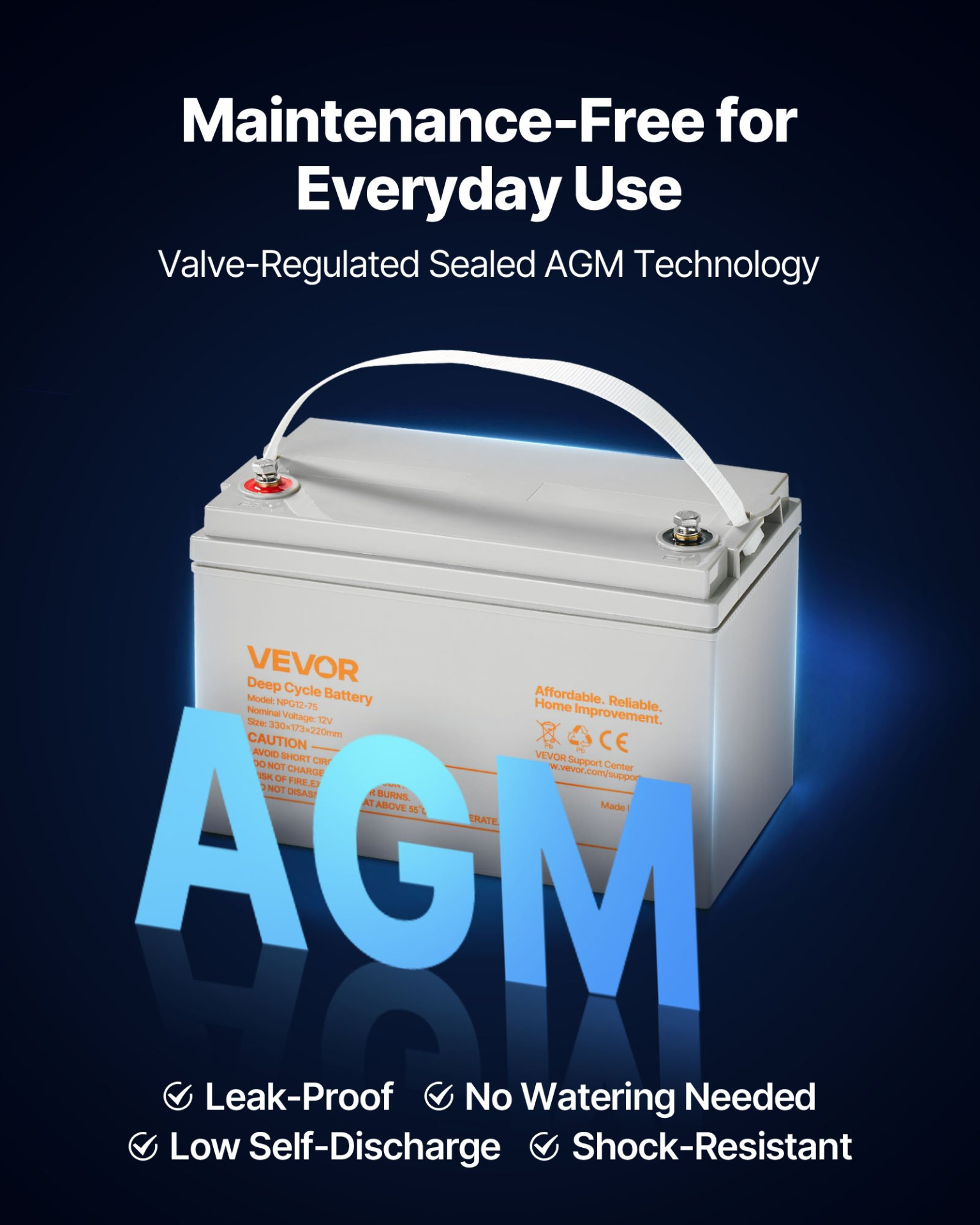 VEVOR 12V 75Ah Deep Cycle Battery, Sealed AGM Technology, Rechargeable Lead Acid AGM Battery, Backup Replacement for Scooters, Electric Mobility Wheelchair, Solar System Off-Grid Home Energy Storage