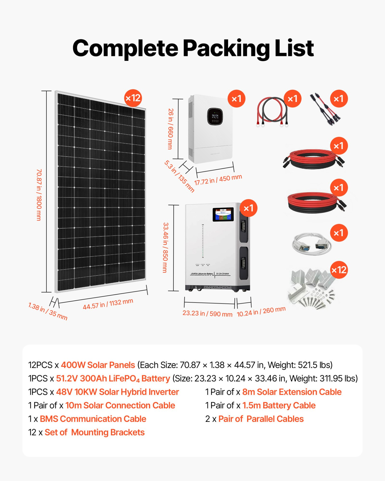 VEVOR 4800W 48V Complete Solar Power Kit, 12*400W Monocrystalline Solar Panels + 51.2V 300Ah LiFePO₄ Battery + 48V 10KW Hybrid Inverter, Super High Output Off-Grid Solar Kit for Large House Shed Farm