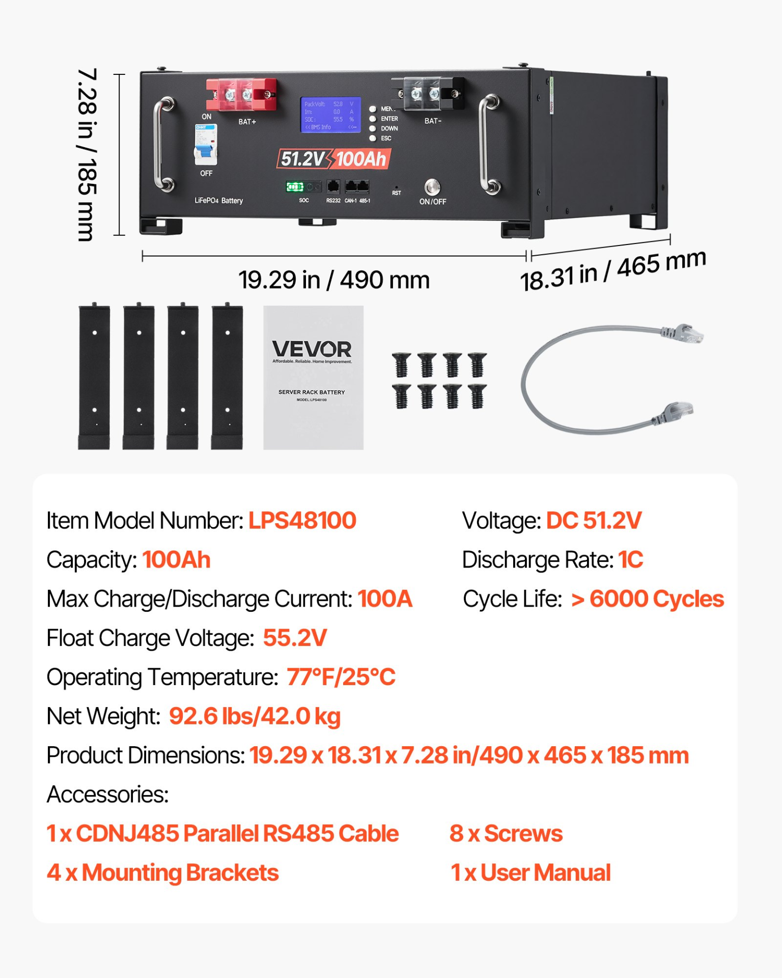 VEVOR 48V 100Ah LiFePO4 Lithium Battery, Built-in 100A BMS, 51.2V Server Rack LiFePO4 Battery with Bluetooth, 5.12kWh Capacity, Max 6000 Cycles, LCD Display, for Off-Grid, Solar System, Backup Power