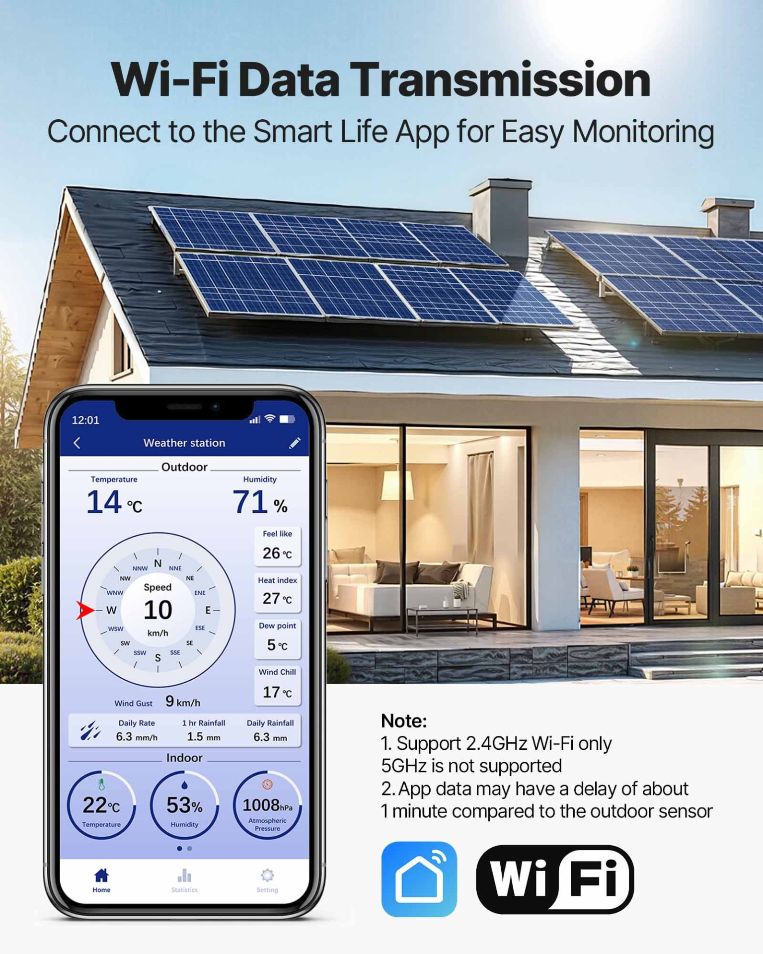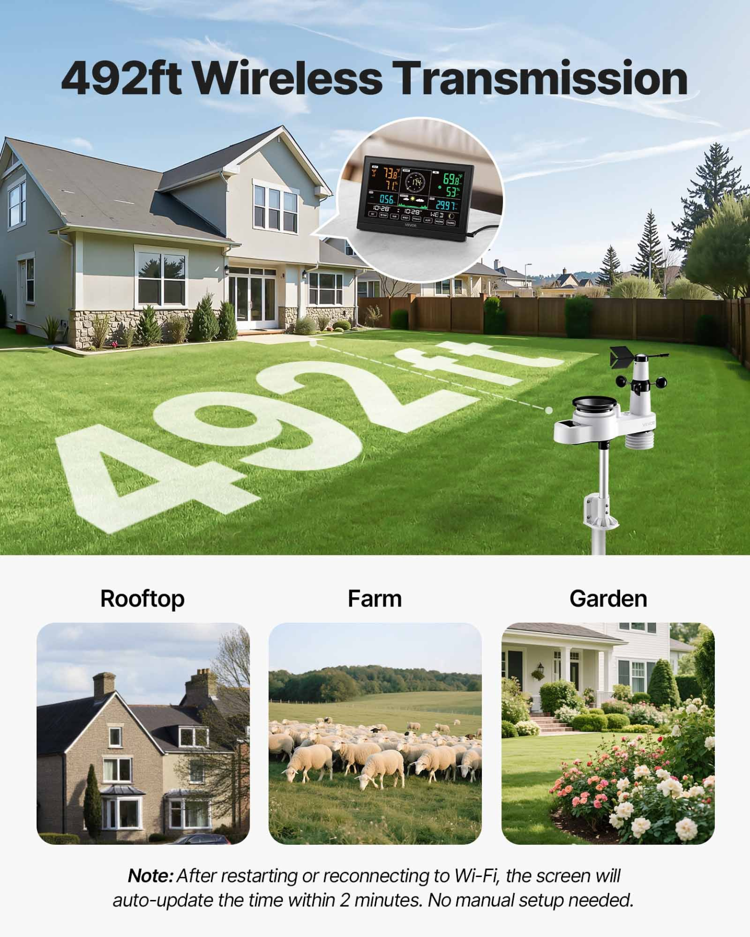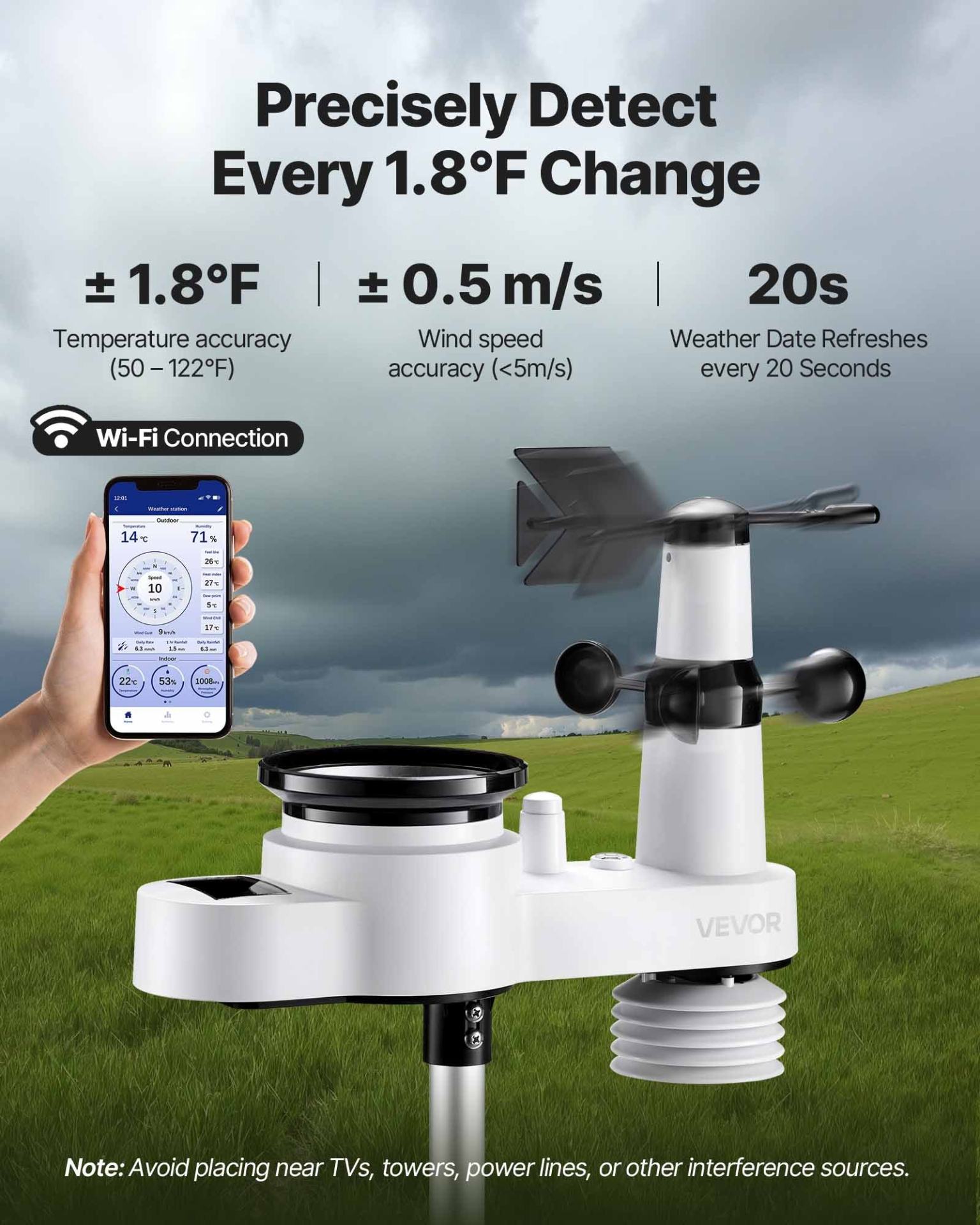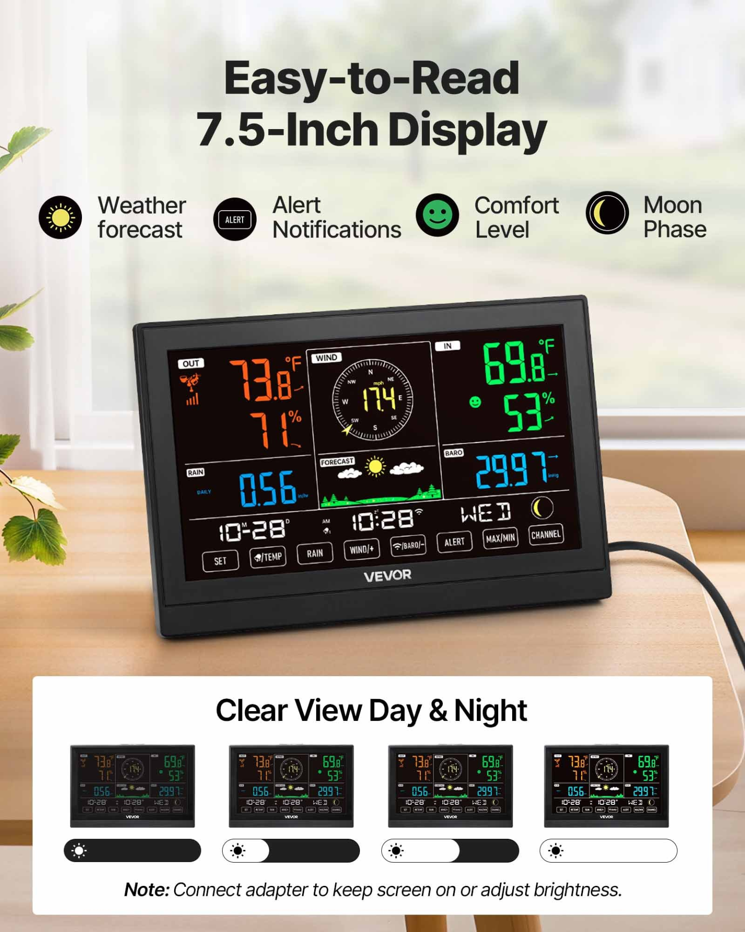 VEVOR 5-in-1 Wi-Fi Weather Station, 7.5-Inch VA Display, Wireless Solar Powered Outdoor Sensor, Rain Gauge, Indoor Outdoor for Weather Forecast, Wind Speed Direction, Temperature, Humidity, Rainfall