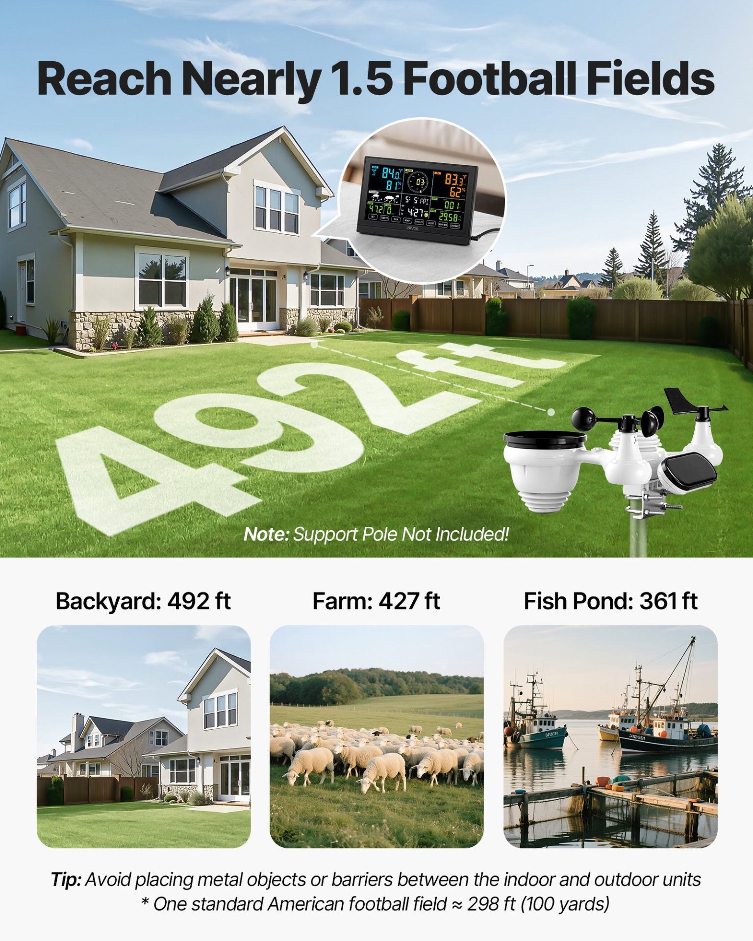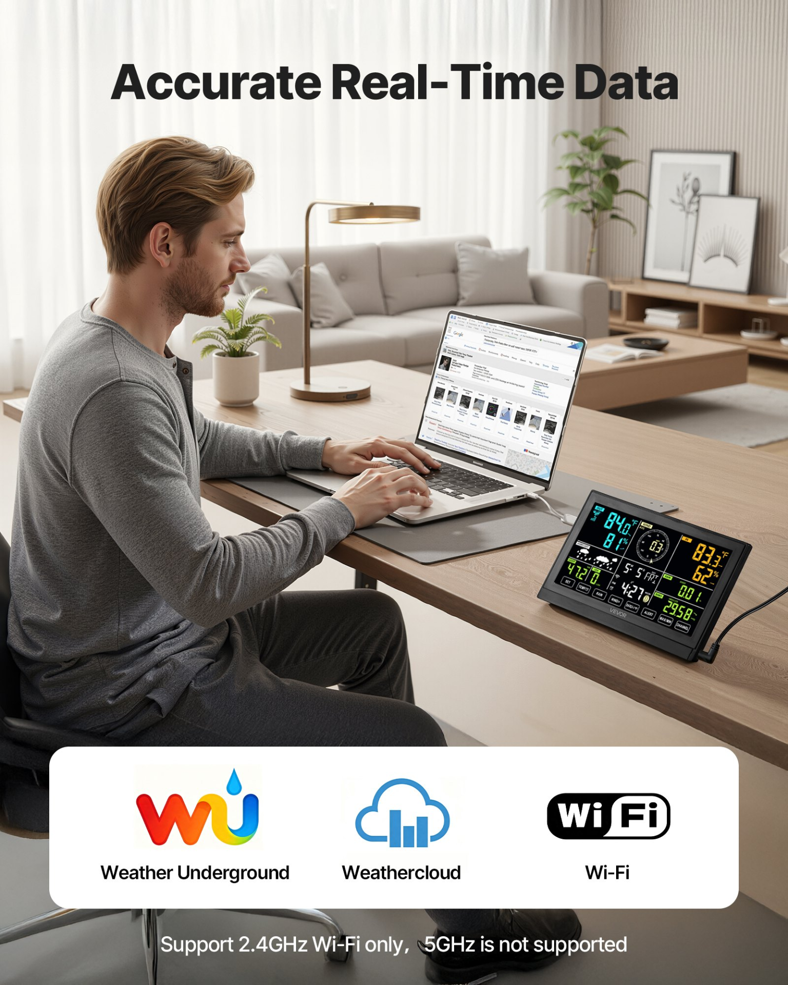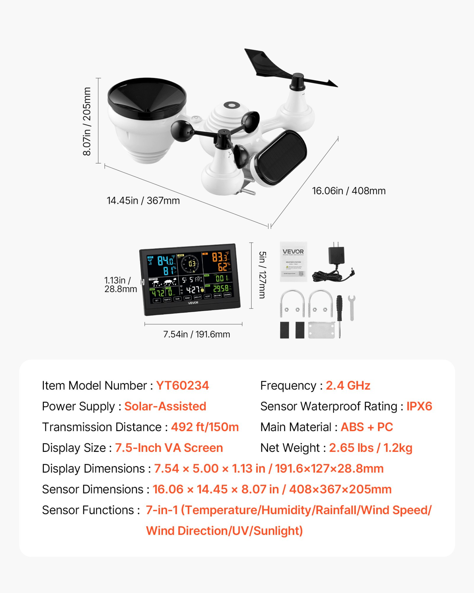 VEVOR 7-in-1 Wi-Fi Weather Station, 7.5-Inch VA Display, Solar Powered Wireless Outdoor Sensor, Home Weather Station Indoor Outdoor, for Temperature, Humidity, Wind Speed/Direction, Rainfall, No APP