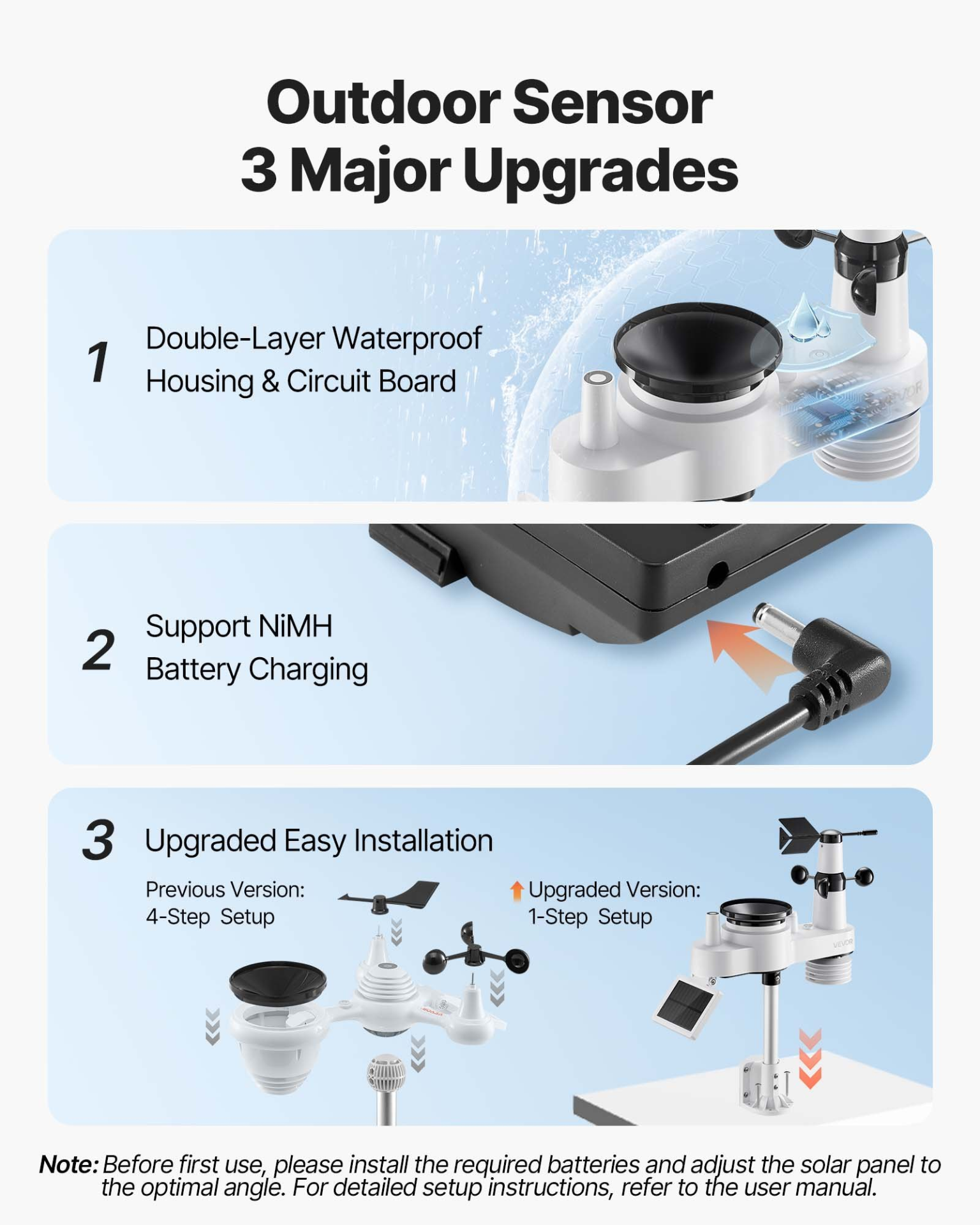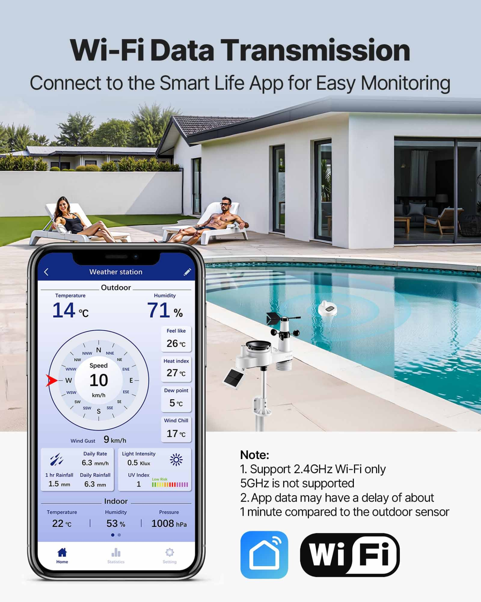 VEVOR 7-in-1 Wi-Fi Weather Station with APP, 7.5 in Display, Wireless Solar Powered Outdoor Sensor, with Pool Thermometer, Rain Gauge, Indoor Outdoor for Weather Forecast, Wind Speed, Pool Temperature