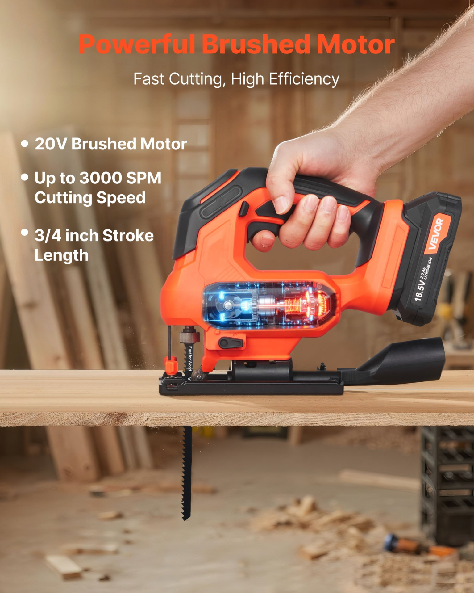 VEVOR Cordless Jig Saw, 20 V, 3000 SPM Blade Speed, Cordless Jigsaw with Battery and Charger, LED Light, 6 Variable Speed, 0- 45° Bevel Cuts, with 6 pcs Blades, 4 Orbital Settings, for Wood, Metal