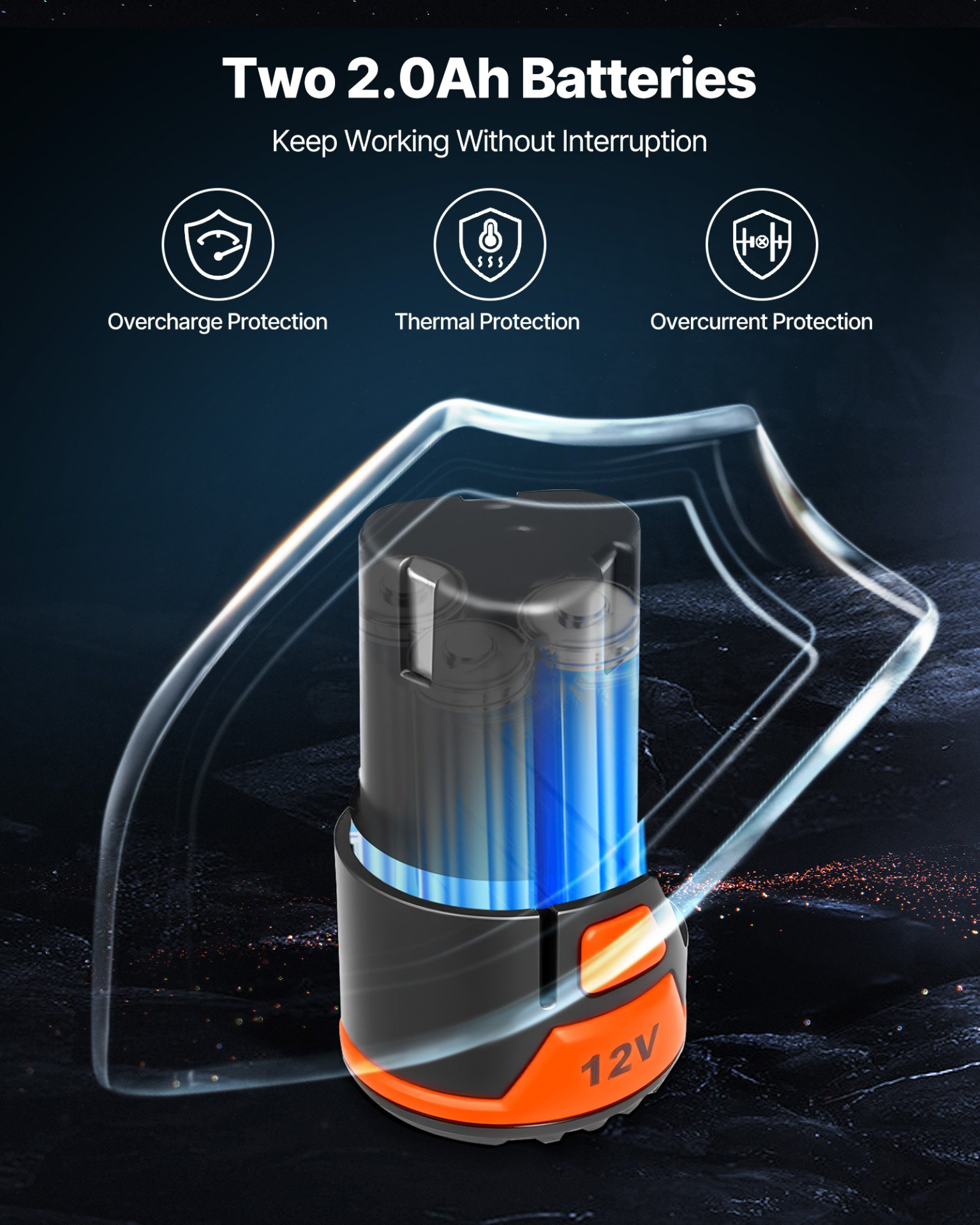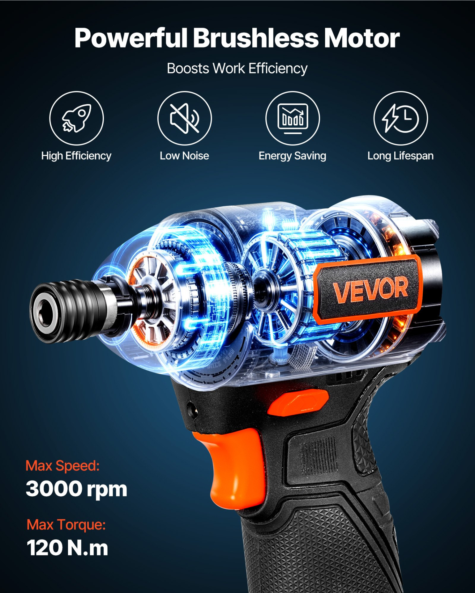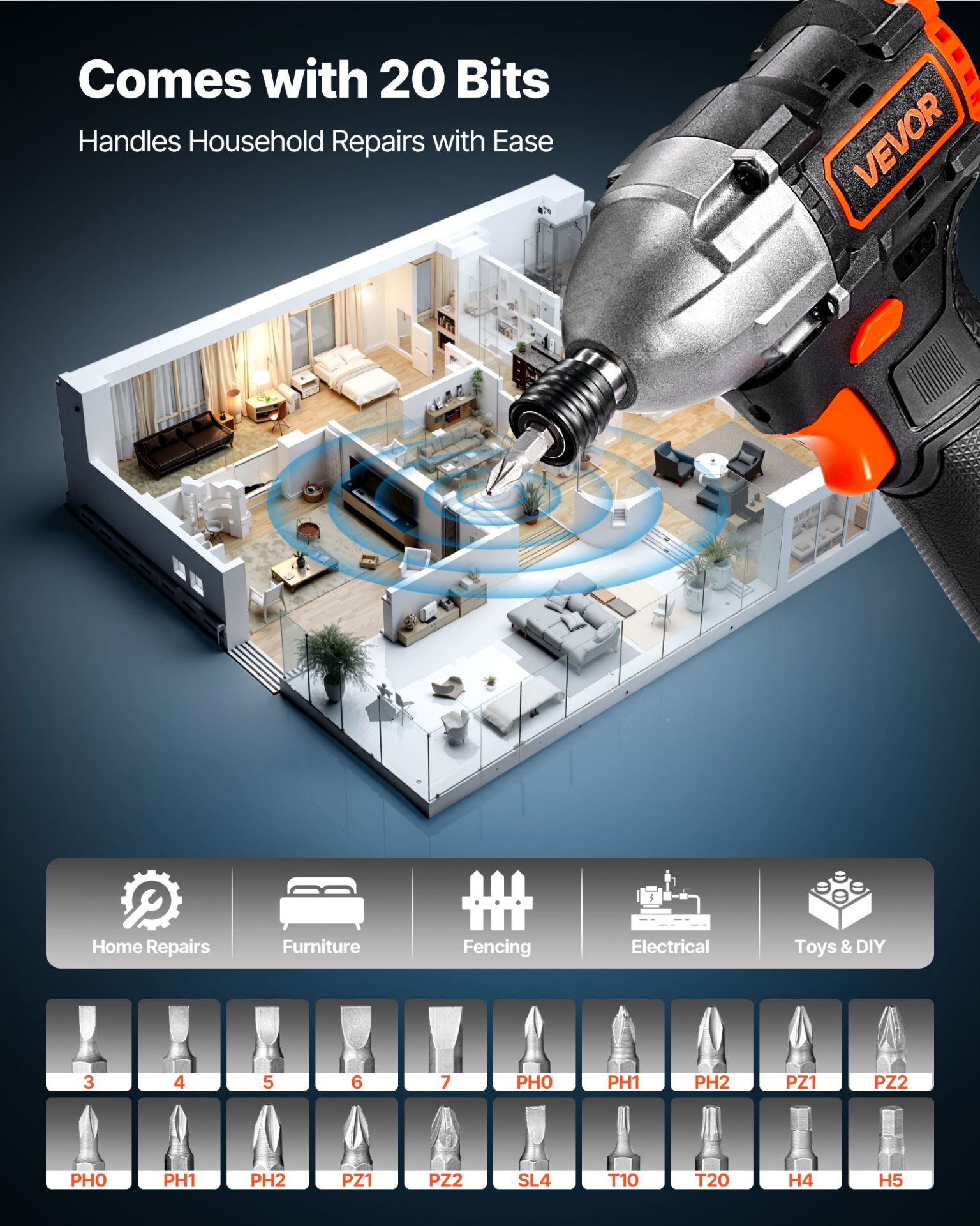 VEVOR Impact Driver, 1/4 Inch, 3000 RPM Max Speed, 12 V Brushless Motor, Electric Cordless Impact Driver Kit with Battery and Charger, 20 Bits, LED Work Light, for Furniture, Electrical, Home Repairs