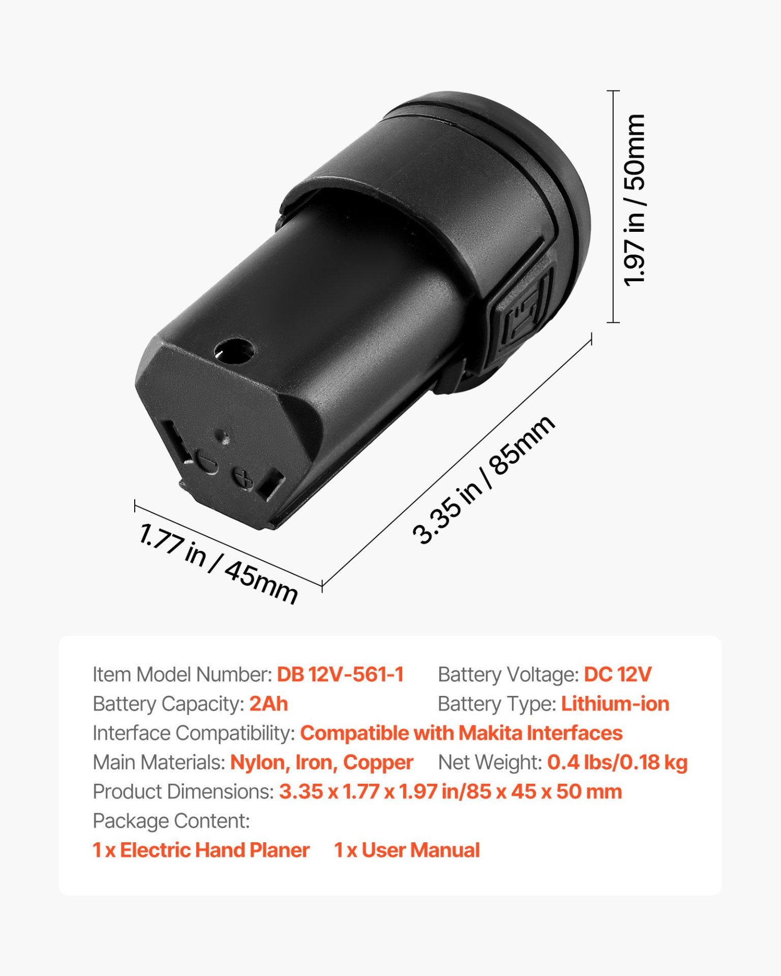 VEVOR Lithium-Ion Battery, 12V 2Ah, Portable Lithium Battery Pack Replacement, with Universal Adapter, Easy to Carry, Compatible with Makita Interfaces, VEVOR Cordless Electric Hand Planer, 1-Pack